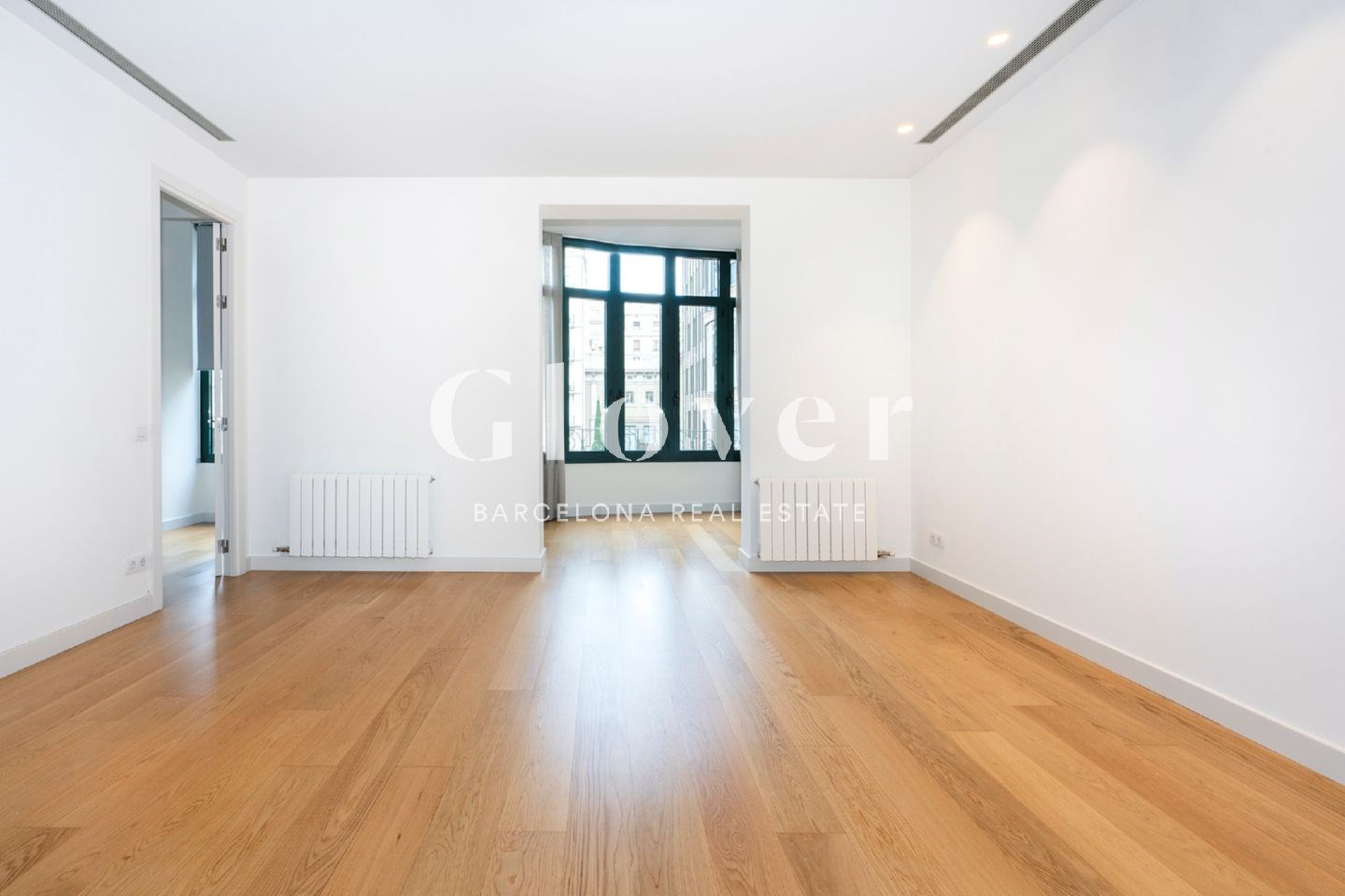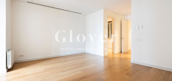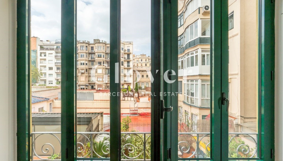 El luminoso salón-comedor, con grandes ventanales, ofrece vistas a un tranquilo y verde patio típico del Eixample, creando un ambiente de calma en pleno corazón de la ciudad. Desde aquí se accede a la suite principal, con un elegante vestidor con armarios empotrados y un baño privado con bañera.
